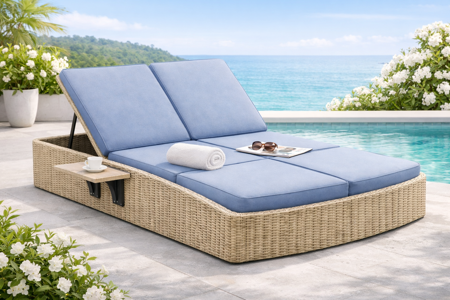This outdoor sofa set combines woven rattan texture with soft cushions, creating a comfortable seating space for patios, gardens, or balconies.